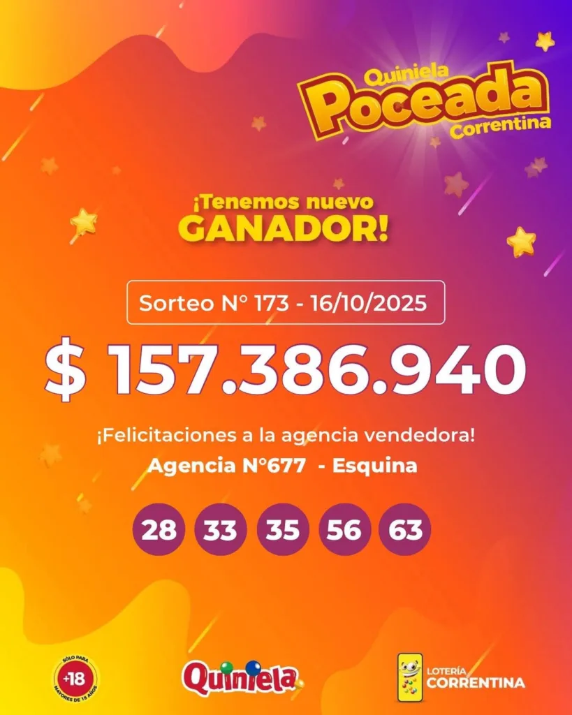 La Lotería Correntina confirmó este jueves que un apostador de Esquina obtuvo el premio mayor de la Quiniela Poceada Correntina, acumulando una suma que supera los 157 millones de pesos.