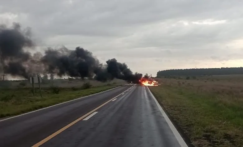 Tras el fuerte impacto, el vehículo se incendió en la banquina y las llamas se extendieron hacia pastizales cercanos.