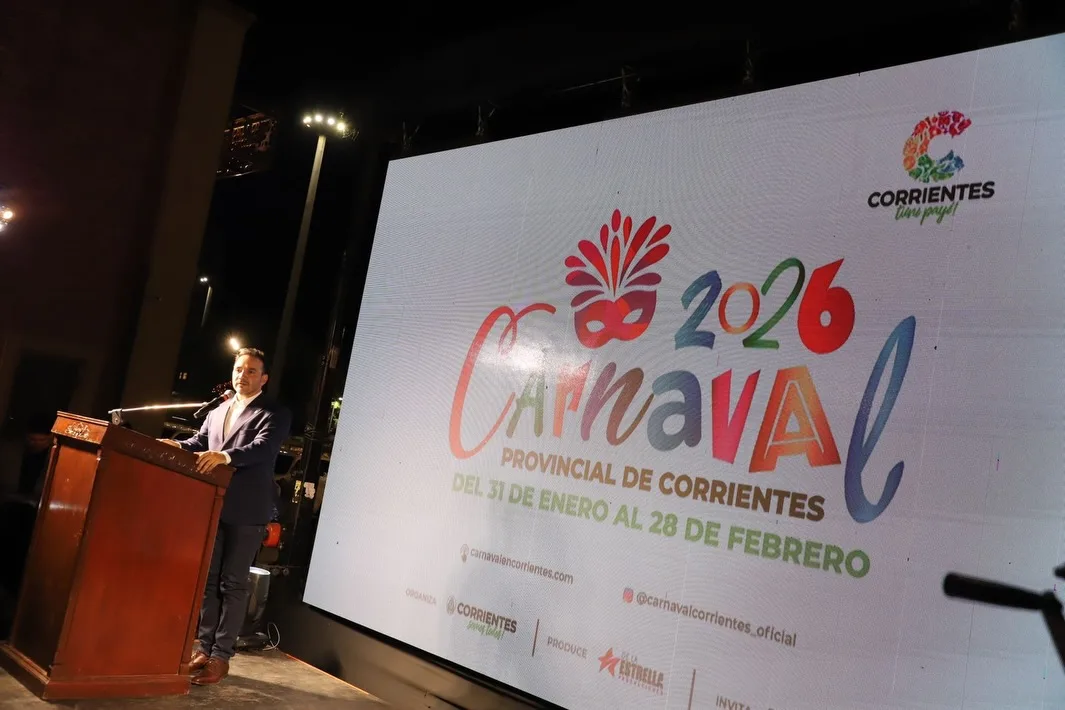El Carnaval de Corrientes 2026 fue presentado oficialmente este viernes con un acto encabezado por el gobernador Juan Pablo Valdés en el predio de La Unidad. La máxima fiesta a cielo abierto de la provincia se desarrollará del 31 de enero al 28 de febrero, con desfiles, shows de comparsas, duelos de baterías y nuevas obras en el Corsódromo “Nolo Alías”, consolidando su impacto cultural, turístico y económico.