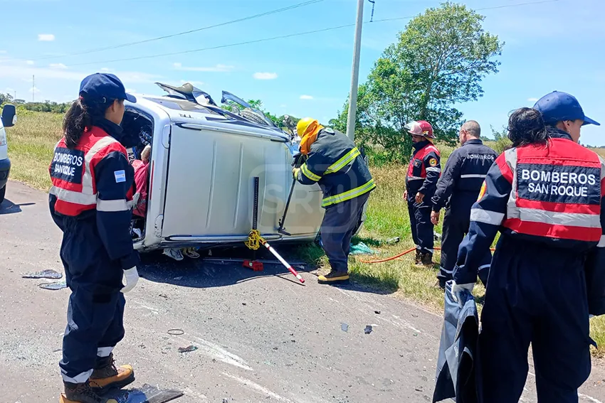 Bomberos voluntarios de San Roque debieron intervenir utilizando herramientas de expansión y corte para rescatar a los ocupantes que habían quedado atrapados dentro del vehículo.