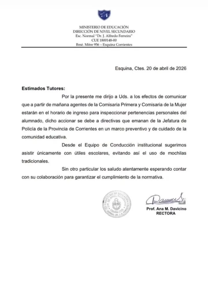 En un contexto de medidas preventivas que ya se vienen implementando en distintos puntos de la provincia de Corrientes, a raíz de reiteradas amenazas en instituciones educativas mediante mensajes intimidatorios y advertencias escritas, la Escuela Normal Dr. J. Alfredo Ferreira de Esquina emitió un comunicado dirigido a los tutores informando que este martes 21 de abril se realizarán controles en el ingreso al establecimiento.