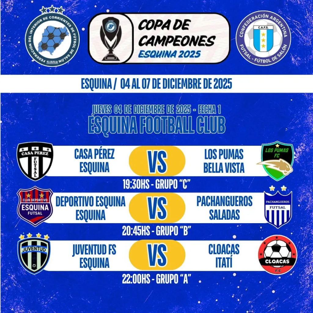 La ciudad de Esquina se convierte desde hoy en sede del torneo provincial más destacado del futsal correntino. La Copa de Campeones reúne a 12 clubes de distintas asociaciones del interior, en una competencia que promete gran nivel deportivo y fuerte acompañamiento del público local.