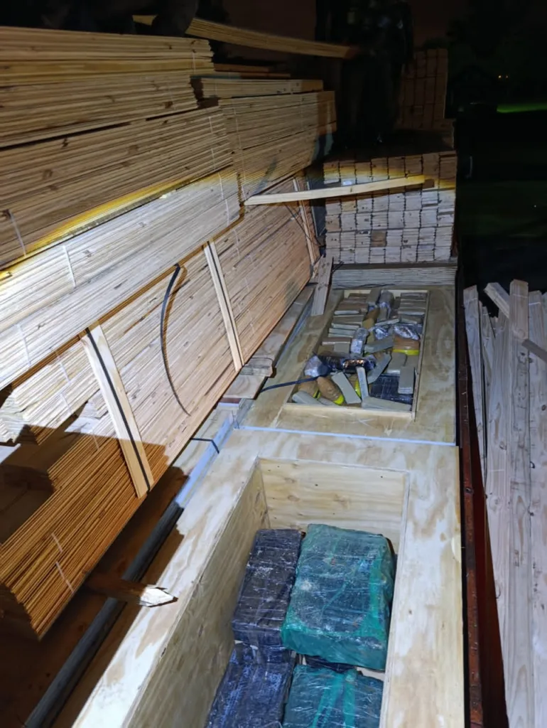 El transporte fue trasladado al Complejo Terminal de Cargas para un escaneo detallado. Las imágenes revelaron la presencia de cuerpos extraños entre las placas de madera, lo que confirmó la existencia de un doble fondo preparado para ocultar estupefacientes.