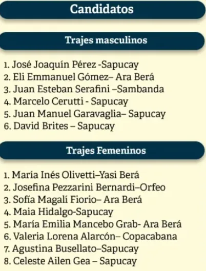 La ciudad de Esquina contará con presencia destacada en la elección. Por un lado, competirá por mejor traje femenino María Inés Olivetti, representante de la comparsa Yasí Berá.