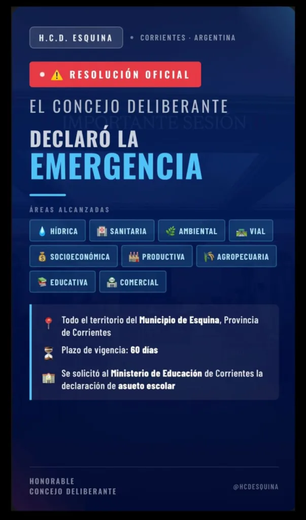 El Concejo Deliberante aprobó la declaración de EMERGENCIA HÍDRICA, SANITARIA, AMBIENTAL, VIAL, SOCIOECONÓMICA, PRODUCTIVA, AGROPECUARIA, EDUCATIVA Y COMERCIAL en todo el territorio del Municipio de Esquina, provincia de Corrientes.