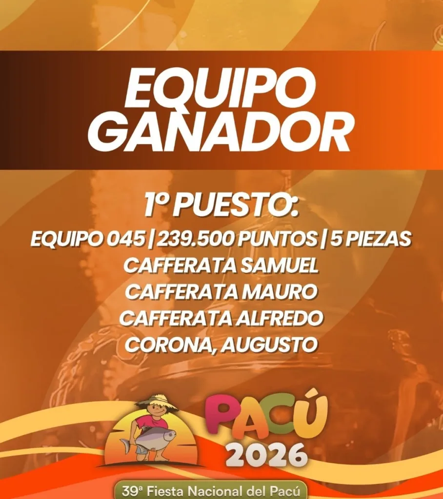 La 39ª Fiesta Nacional del Pacú consagró nuevamente al equipo 045 como ganador del torneo, tras imponerse por cantidad de piezas capturadas y alcanzar cinco ejemplares fiscalizados. Con este resultado, el grupo se convirtió en bicampeón del certamen, repitiendo el logro obtenido en la edición anterior.