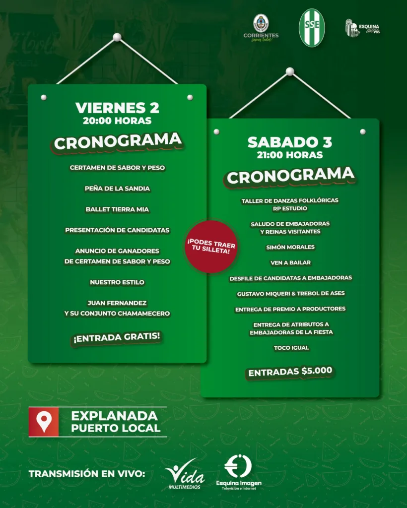 La actividad dará inicio este viernes 2, con entrada libre y gratuita, a partir de las 20 horas en la Explanada del Puerto Local. La primera jornada estará marcada por el desarrollo del Certamen de Sabor y Peso – Peña de la Sandía, donde los productores locales competirán presentando sus mejores frutos.