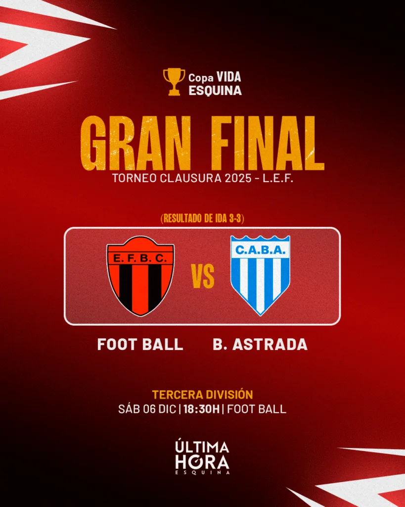Este fin de semana se disputarán las finales de vuelta del Torneo Clausura 2025 – Copa Vida Esquina, tanto en Primera como en Tercera División. Los encuentros se jugarán en cancha de Foot Ball y en Pueblo Libertador, y definirán a los campeones del año.