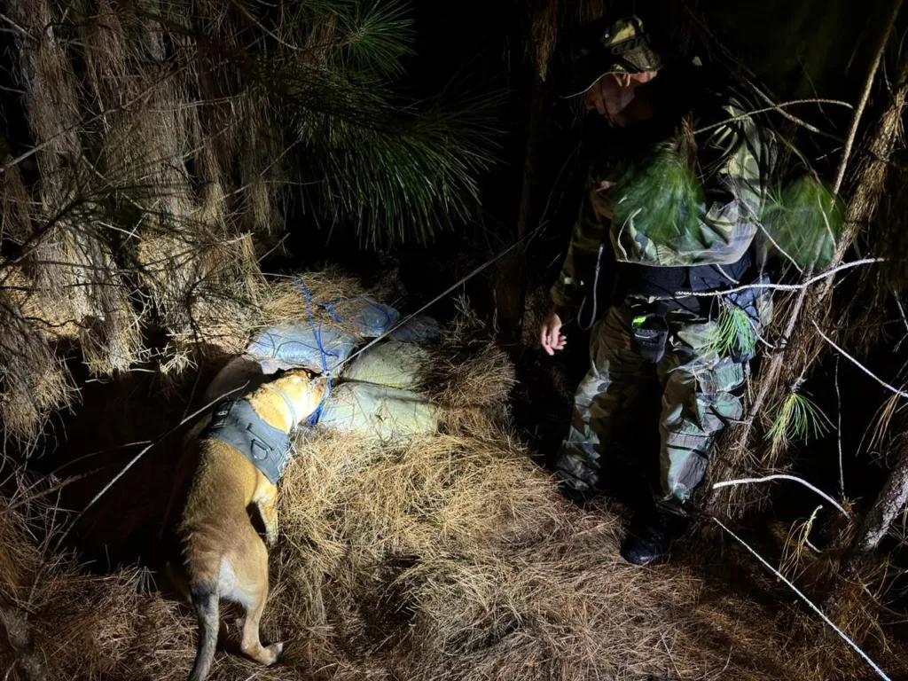 Durante el patrullaje en un área de pinales cercana a la ribera, el animal marcó un punto cubierto con hojas secas. Al revisar el lugar, los efectivos encontraron 13 bultos que contenían 52 envoltorios con sustancia prensada, con un peso superior a los 128 kilogramos y un valor que supera los 457 millones de pesos.