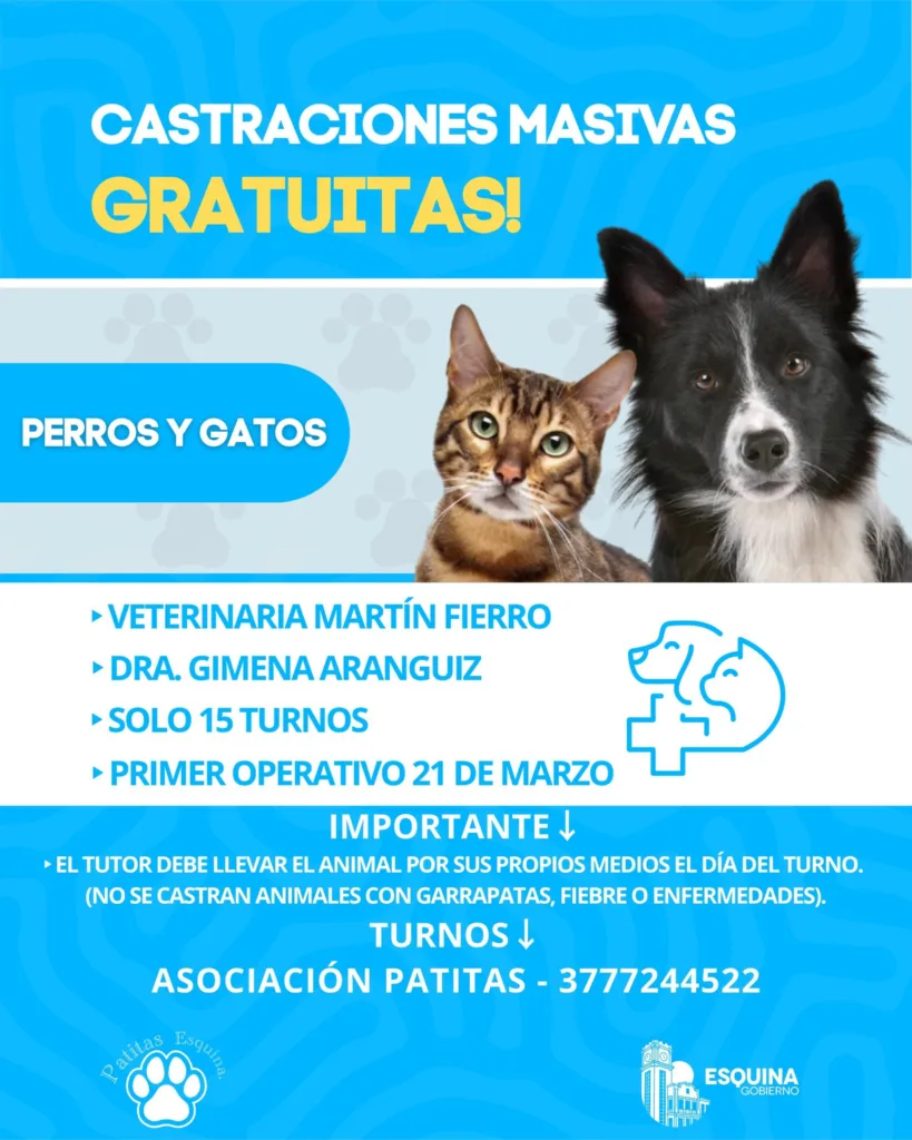 Integrantes de la asociación Patitas Esquina anunciaron una jornada gratuita de castración para perros y gatos en Esquina, que se llevará a cabo el próximo sábado 21 de marzo. La iniciativa busca avanzar en el control de la población animal y reducir el abandono de mascotas en la ciudad.
