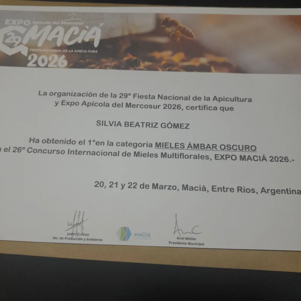 Este reconocimiento posiciona a “El Apiario y sus Mieles” entre los mejores emprendimientos apícolas del continente, reflejando el trabajo, la dedicación y el compromiso en el cuidado de las abejas y la producción.