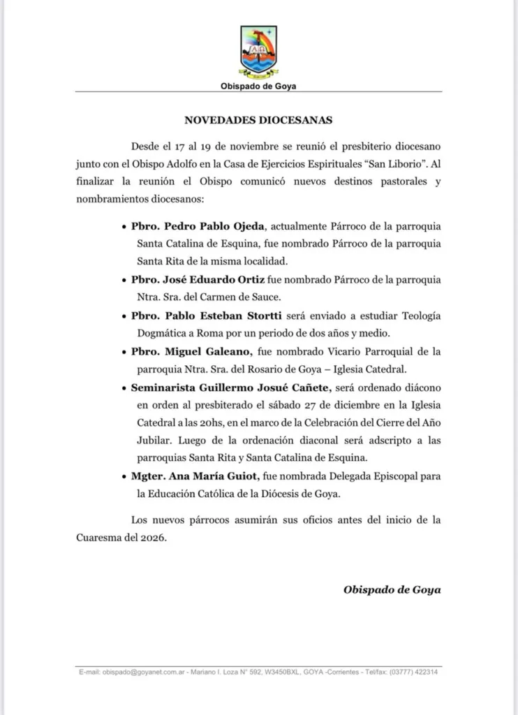 El nombramiento de Pedro Pablo Ojeda como párroco de Santa Rita de Esquina forma parte de una serie de decisiones pastorales anunciadas por el Obispado de Goya tras el encuentro del presbiterio diocesano.