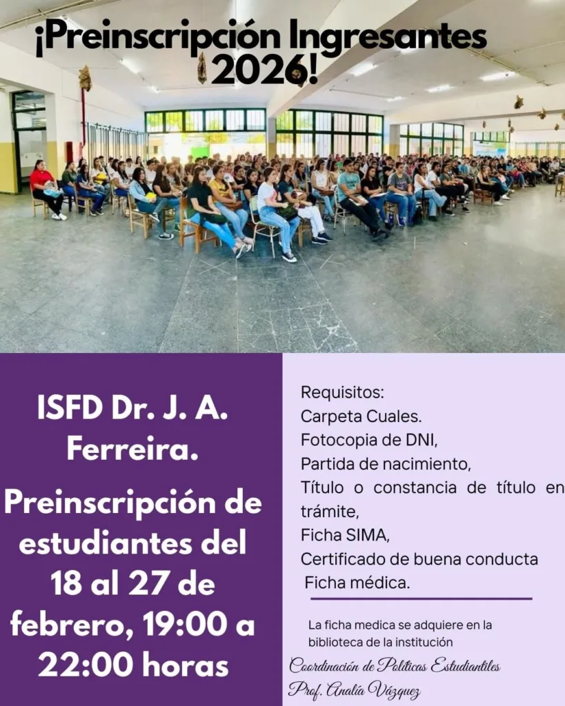 El ISFD Dr. J. A. Ferreira informó la apertura del período de preinscripción para ingresantes 2026, destinado a estudiantes que deseen iniciar sus estudios superiores en la institución durante el próximo ciclo lectivo.
