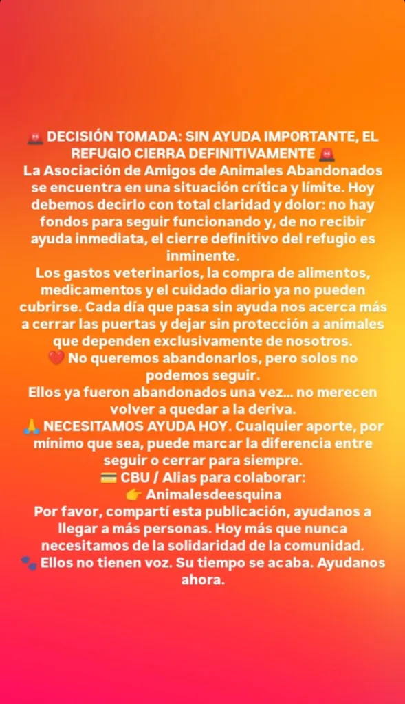 Desde la asociación manifestaron que la decisión de comunicar esta situación no fue sencilla, pero que el escenario actual los obliga a hacerlo con total claridad. Cada día que pasa sin ayuda acerca al refugio a un cierre definitivo, lo que dejaría a numerosos animales nuevamente en situación de abandono.