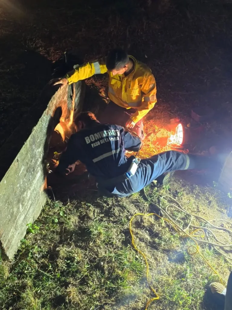 Según se informó, la perra había dado a luz dentro de una alcantarilla de aproximadamente cinco metros de profundidad y no podía salir con sus crías. Ante la situación, personal de Gendarmería dio aviso a los Bomberos Voluntarios, que acudieron rápidamente al lugar.