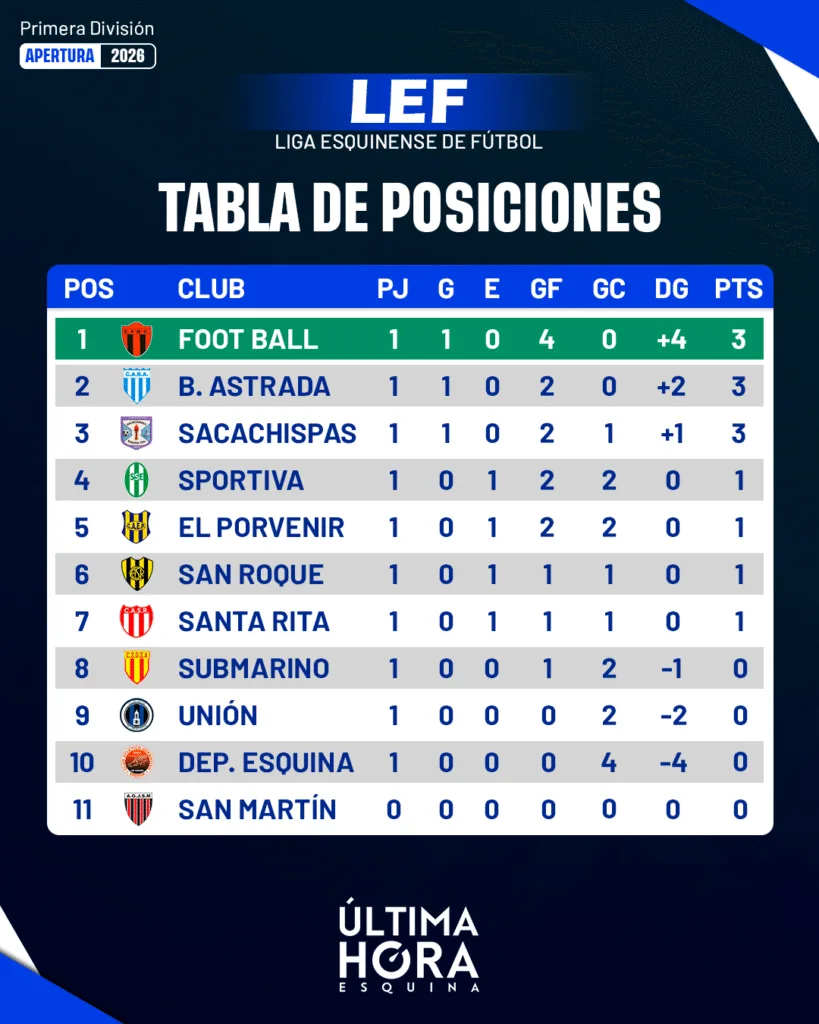 El Torneo Apertura 2026 de la Liga Esquinense de Fútbol puso primera este fin de semana con una jornada completa de partidos en la Primera División. Entre sábado y domingo se disputaron los encuentros de la primera fecha, que dejaron goles, empates y un clásico con dueño.