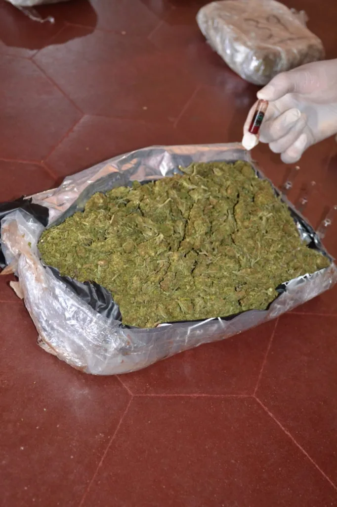 El personal de Criminalística y Estudios Forenses realizó los análisis de campo mediante Narcotest. Las pruebas confirmaron que se trataba de cannabis sativa, con un peso total de 20 kilos y 297 gramos distribuidos en los distintos paquetes.
