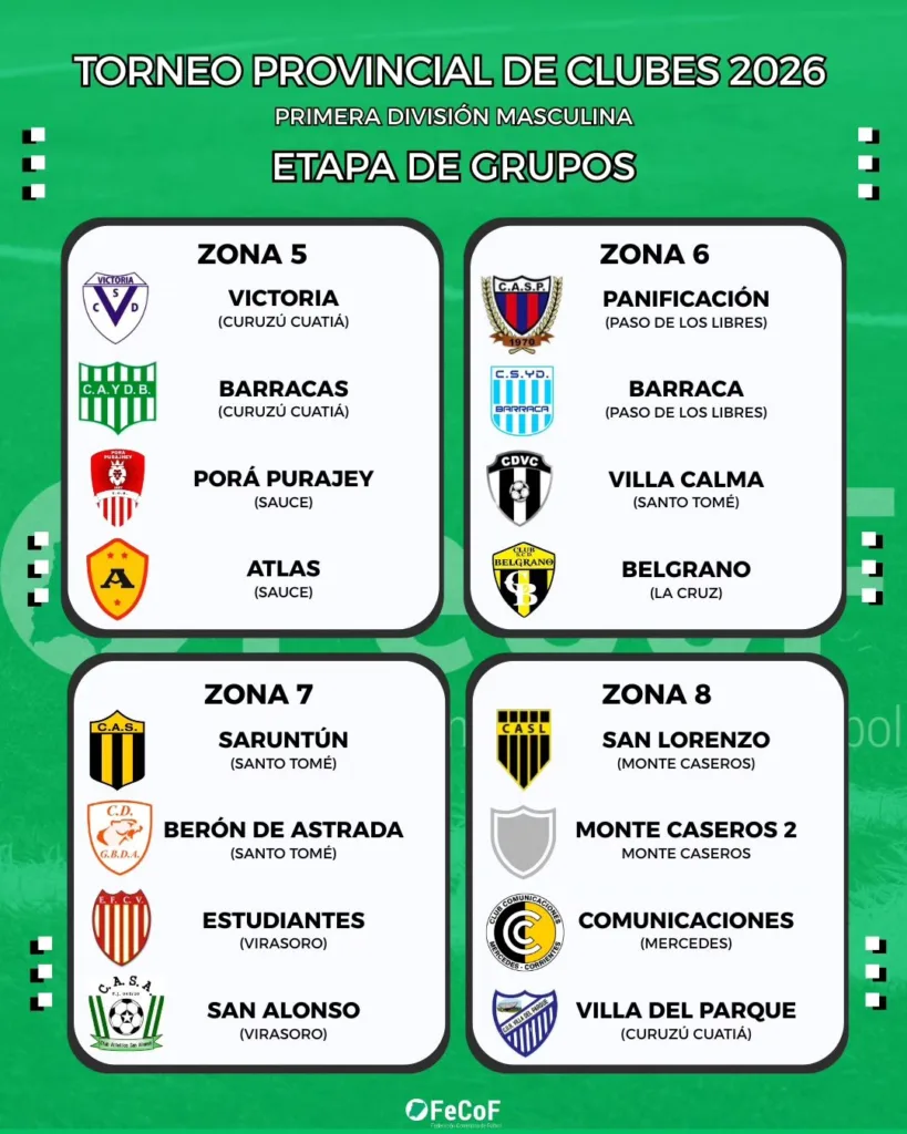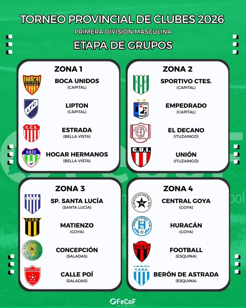 La Federación Correntina de Fútbol confirmó en las últimas horas la conformación de las zonas del Torneo Provincial de Clubes 2026 – categoría Masculino, certamen que dará inicio en el mes de marzo. Los representantes de Esquina ya conocen a los equipos que enfrentarán en la primera fase del campeonato.