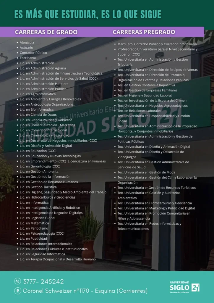 La flamante sede de la Universidad Siglo 21 en Esquina funciona en Coronel Schweizer 1170, donde los interesados pueden acceder a información completa sobre las distintas carreras disponibles y las modalidades de cursado que ofrece la institución.